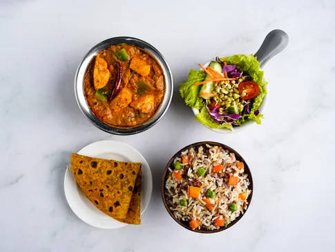 Scoop up the spicy, traditional tawa chicken where minced and roasted chicken comes together in flavourful base served with soft whole wheat parathas. Made healthy with raw veggie salad topped with moong sprouts. Allergen information: Contains Gluten, Nuts, traces of mushroom and celery